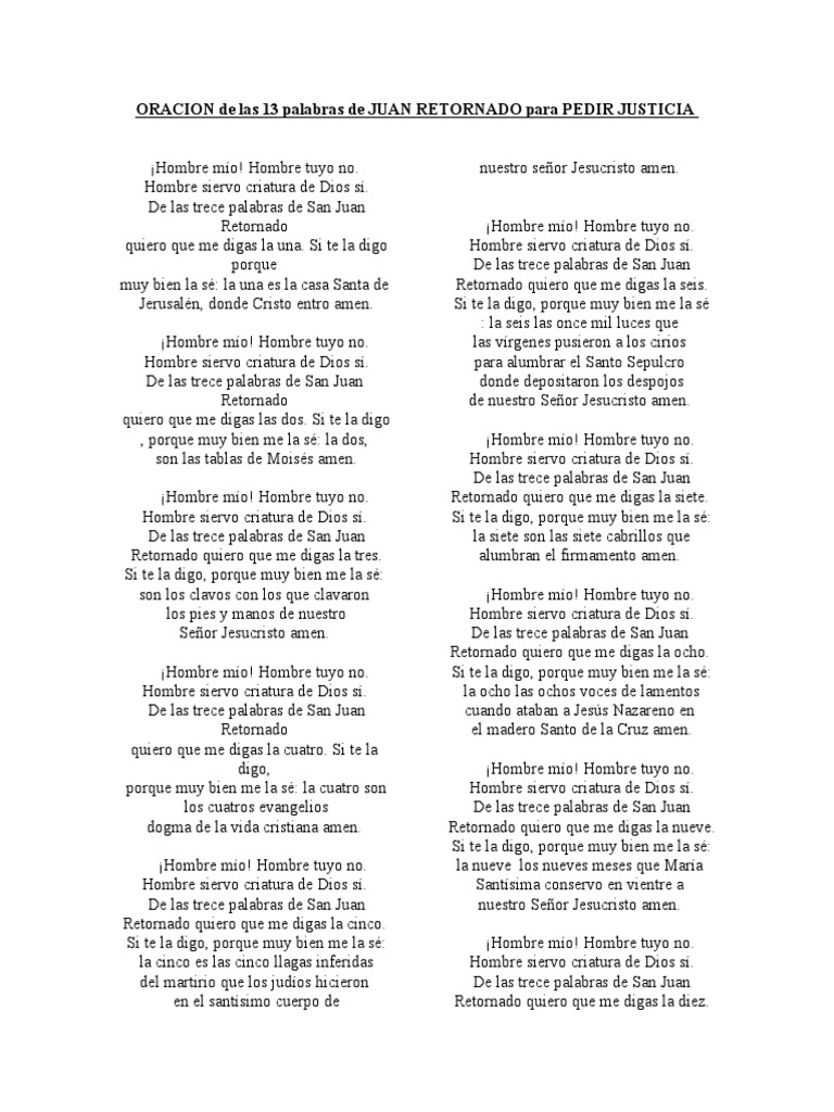 Oracion A San Juan Retornado - Si de las trece palabras de san juan retornado quiero que me diga la número. Hombre mío, hombre tuyo no, hombre siervo, criatura de dios sí;