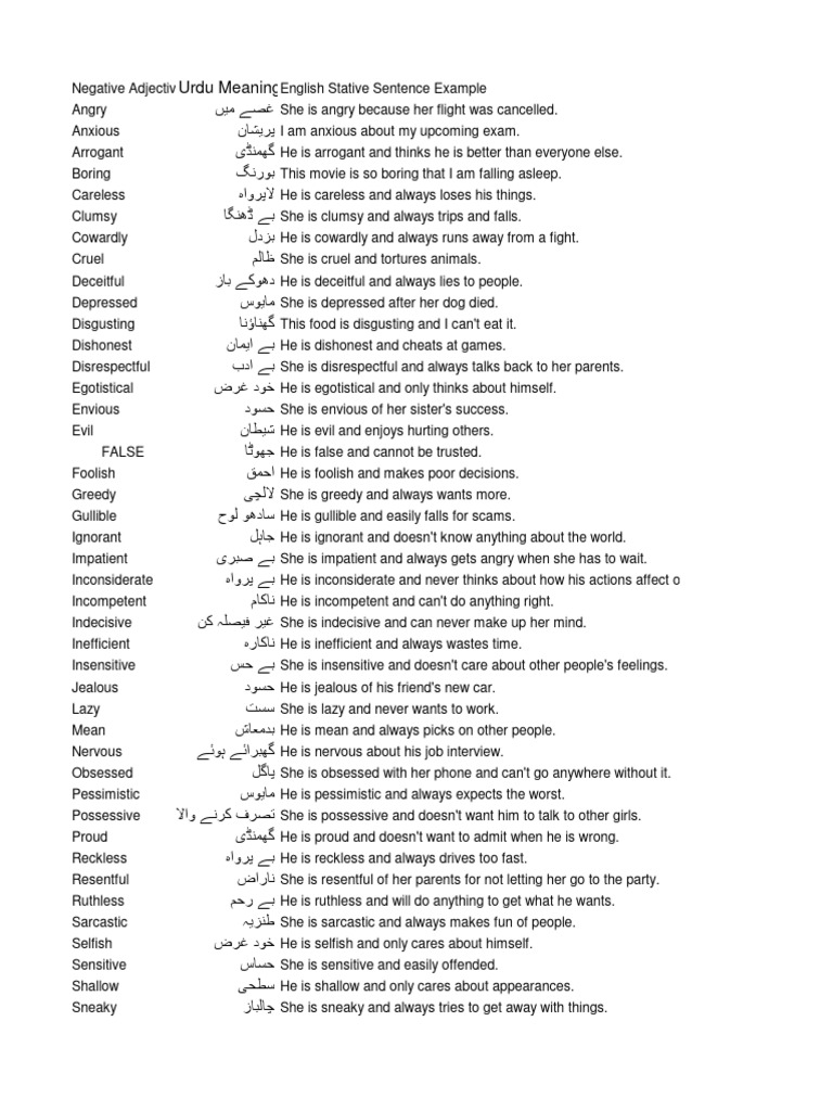 100 Common Negative Adjective With Urdu Meaning & English Stative