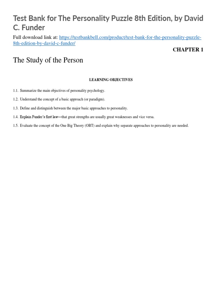 Test Bank For The Personality Puzzle 8th Edition by David C Funder